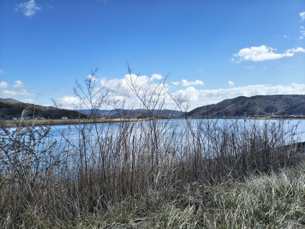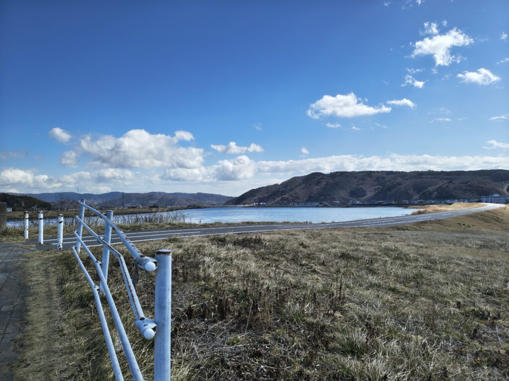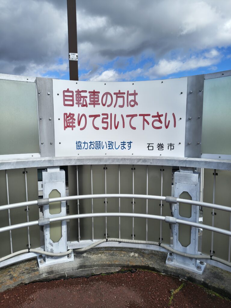 川が見えてきました。いま調べてみたら「旧北上川」というらしいです。……旧? と思って調べてみたら、元々北上川の下流域は洪水が多かったらしく、洪水対策のために別のルートへ水を逃がすようにしたらしいです。それで、いまや穏やかな流れになったこの部分は旧北上川と呼ばれるのだとか。