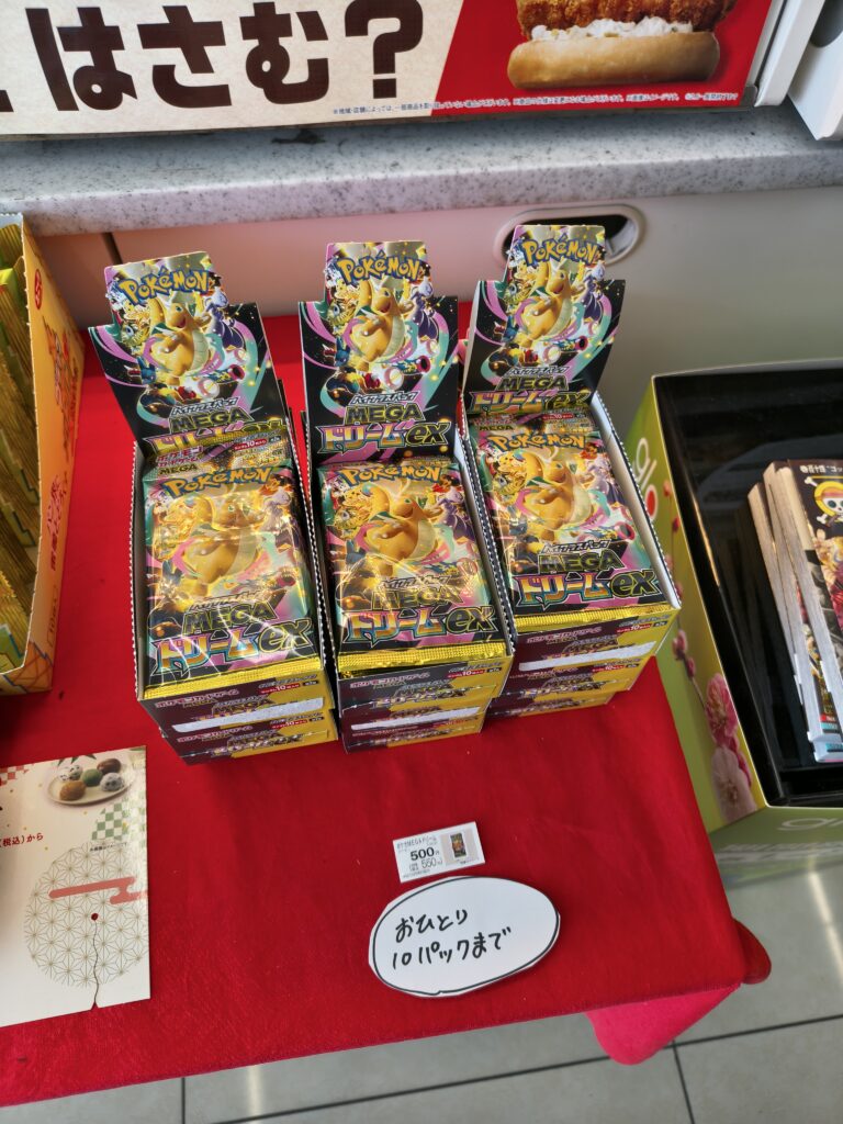 道中のファミリーマート。なんかポケモンカードがめちゃくちゃ残ってた。あとで知り合いに写真を見せたら「買っておけよ!」と言われましたが、私は別にポケモンカードに興味はないので買ってないです。