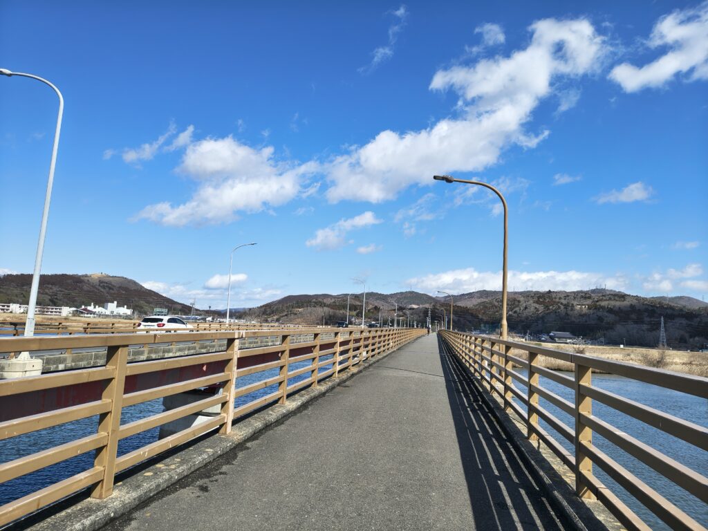 その旧北上川を渡る橋です。この橋、「ヤバ長い」です。