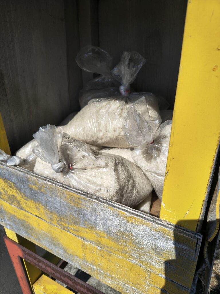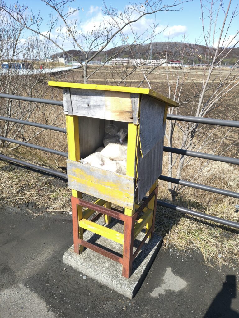 それから、道中で何度か見かけたこれ。最初ギョッとしてしまったのですが、何やらお米みたいなものが入った袋がたくさん置かれてました。